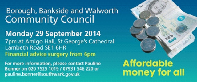 Just a gentle reminder about tomorrow’s Borough, Bankside and Walworth Community Council meeting. The theme is ‘Affordable Money for All’