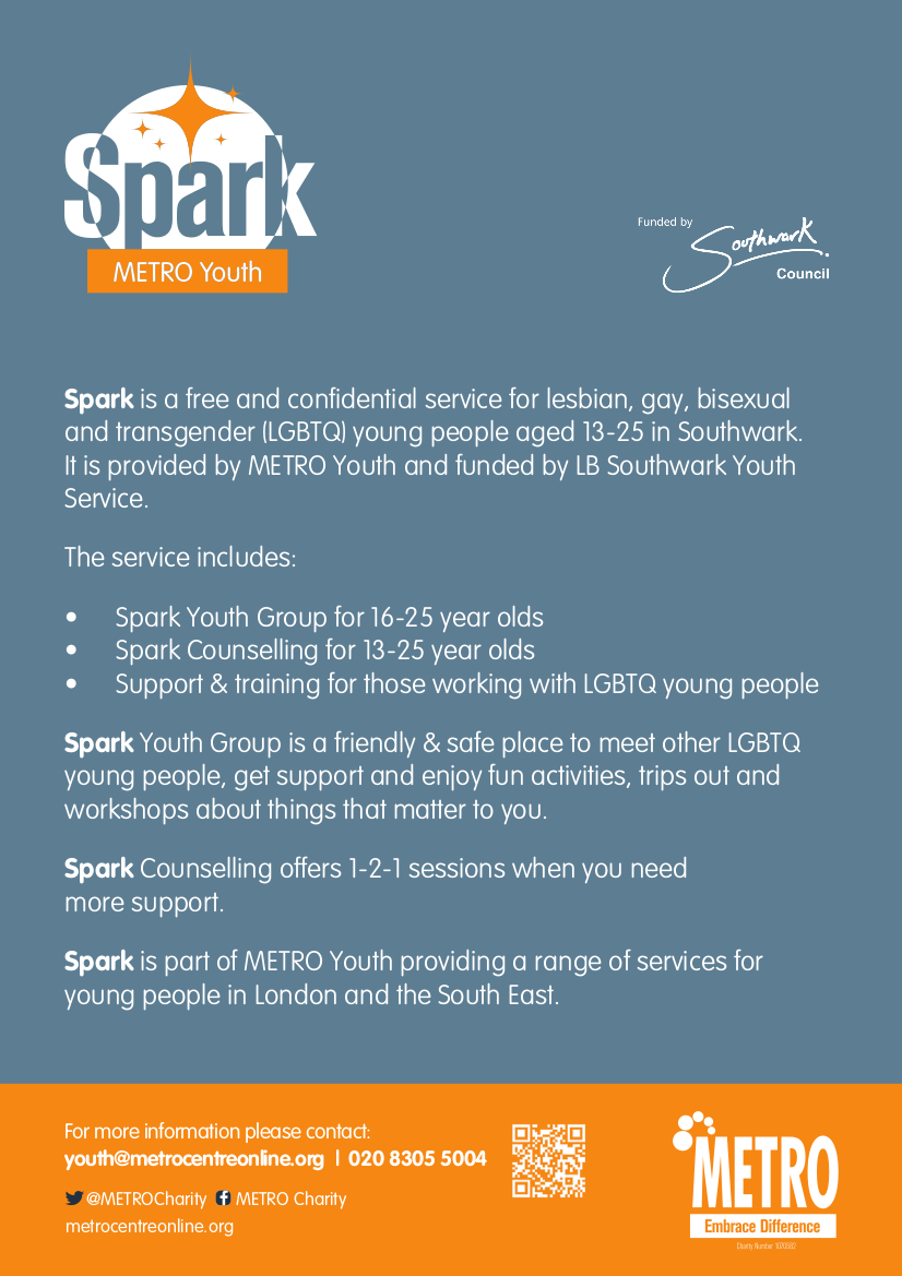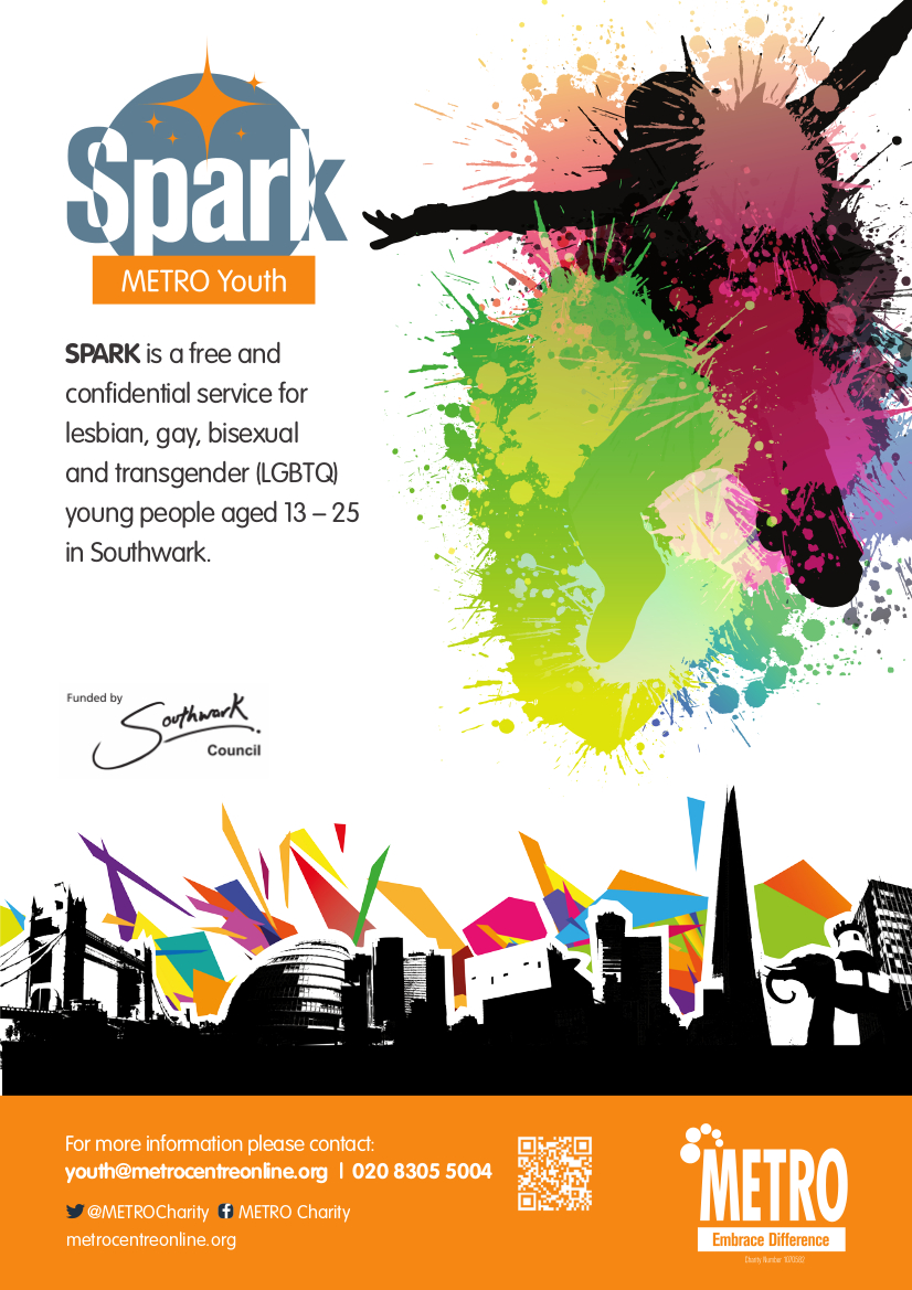 SPARK is a free and confidential service for lesbian, gay, bisexual and transgender (LGBTQ) young people aged 13-25 in Southwark. It is provided by METRO Youth and funded by LB Southwark Youth Service.