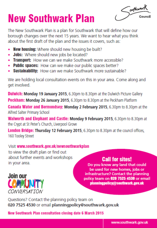 The Council is reviewing the Southwark Plan and Core Strategy to prepare a local plan called the New Southwark Plan. This new plan will set out a regeneration strategy for the next 10-15 years and will be used to make decisions on planning applications. The Council have commissioned an interactive map which will be on-line from mid to late February that will allow interested parties to zoom in on sites and click on sites to provide any detailed comments. The Council have included NSP105 as a potential proposal site. At this stage the Council has not proposed any uses, but are simply identifying the land as a potential site for redevelopment