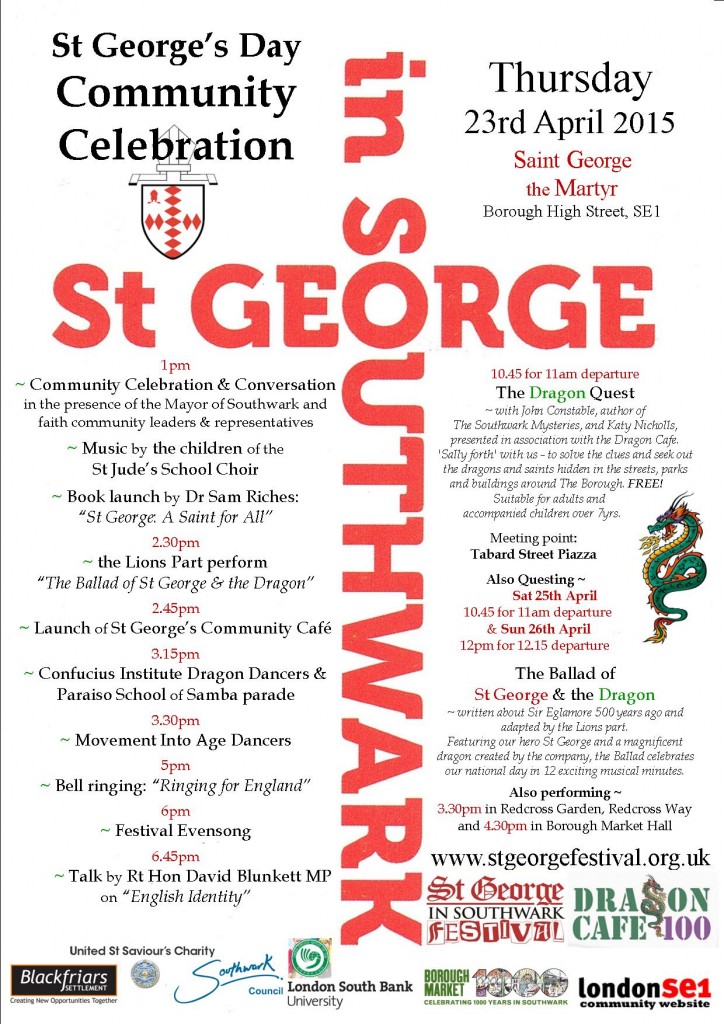 St George’s Day Community Celebration, Thursday 23rd April 2015 Posted by tgntra 0 More information: http://www.stgeorgefestival.org.uk/ Share this: Click to share on X (Opens in new window) X Click to share on Facebook (Opens in new window) Facebook Like Loading... Related