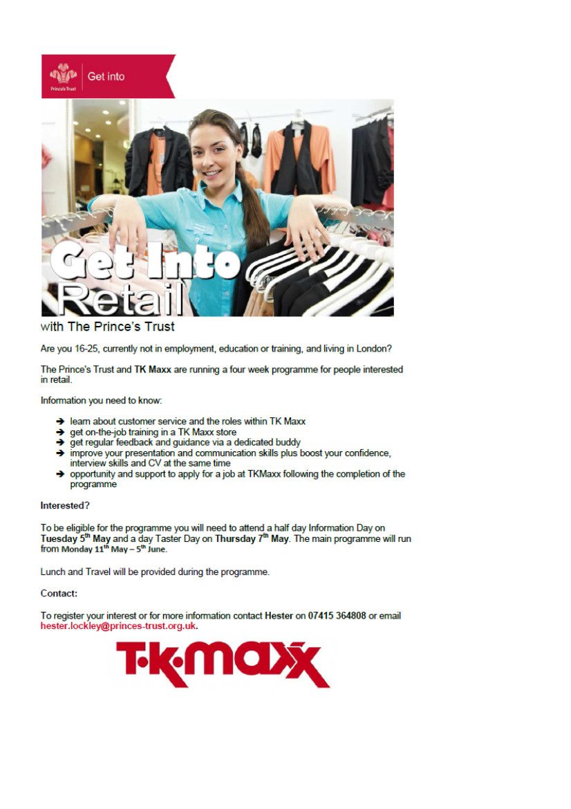 Get Into Retail, information day 5th May. Posted by tgntra 0 Share this: Click to share on X (Opens in new window) X Click to share on Facebook (Opens in new window) Facebook Like Loading... Related