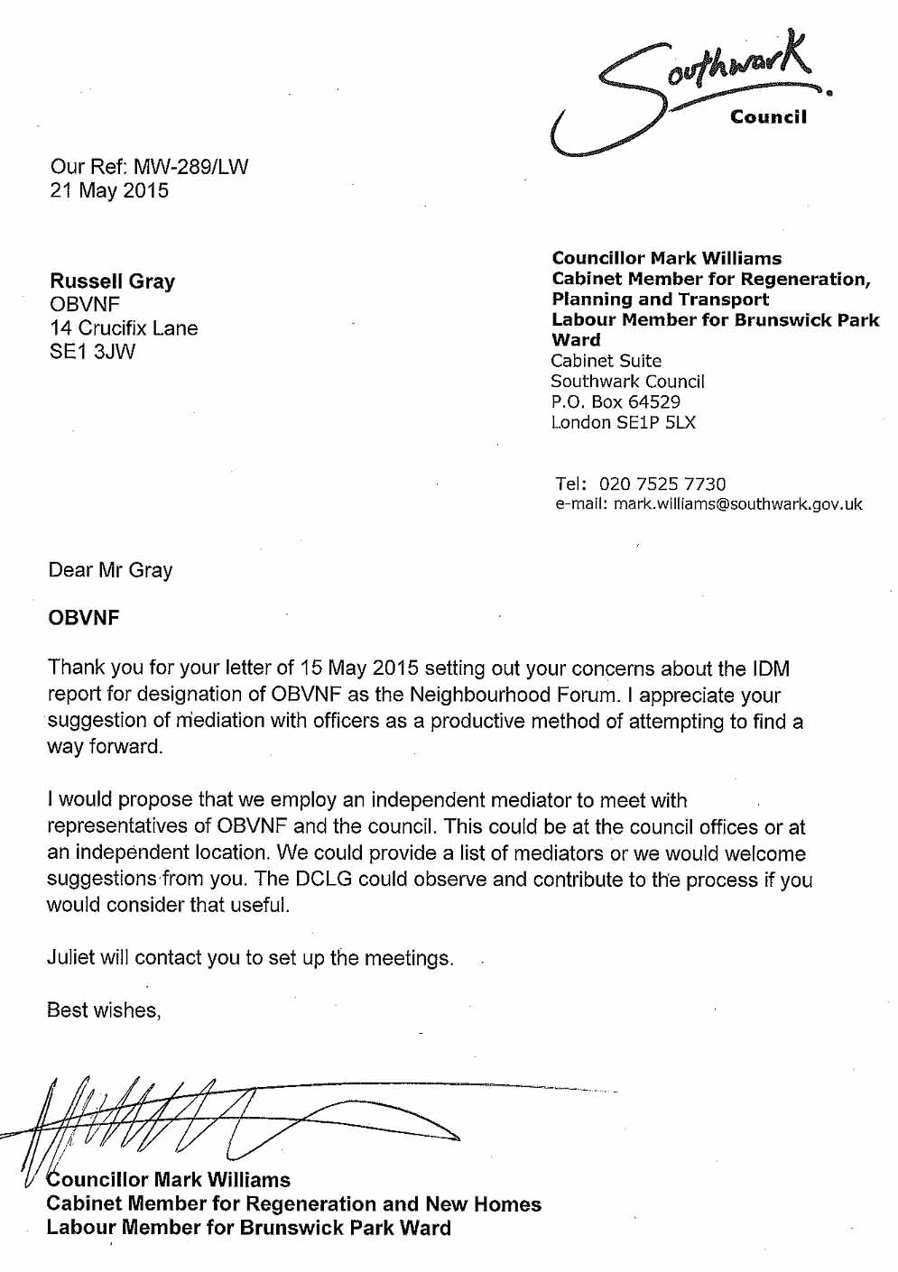 Just as we sent yesterday’s mailout highlighting the Councl’s dilemma over recognising OBVNF we received the letter below effectively acknowledging it.