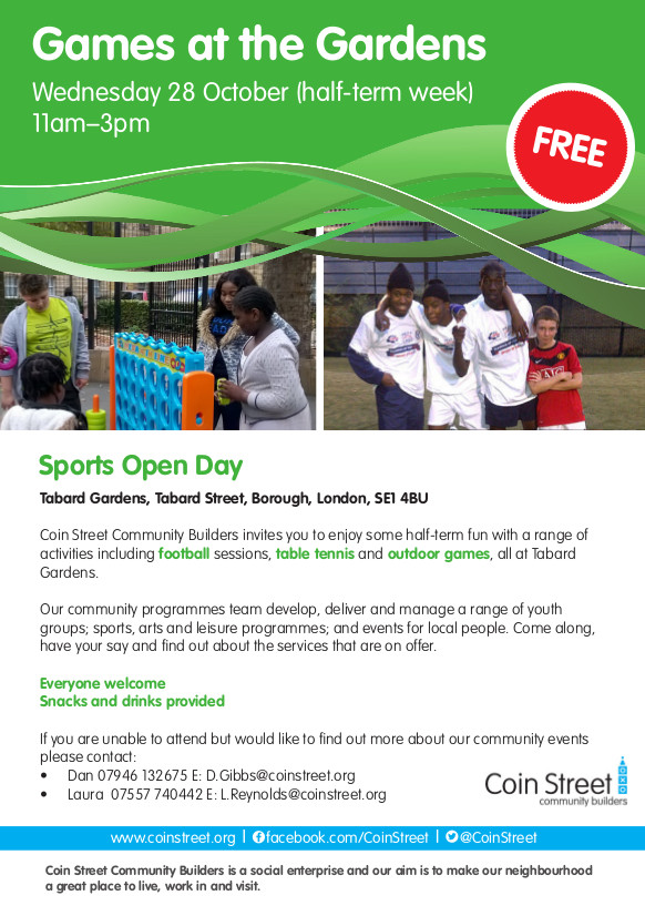Free Sports Open Day in Tabard Gardens, Wednesday 28th October Posted by tgntra 0 Share this: Click to share on X (Opens in new window) X Click to share on Facebook (Opens in new window) Facebook Like Loading... Related