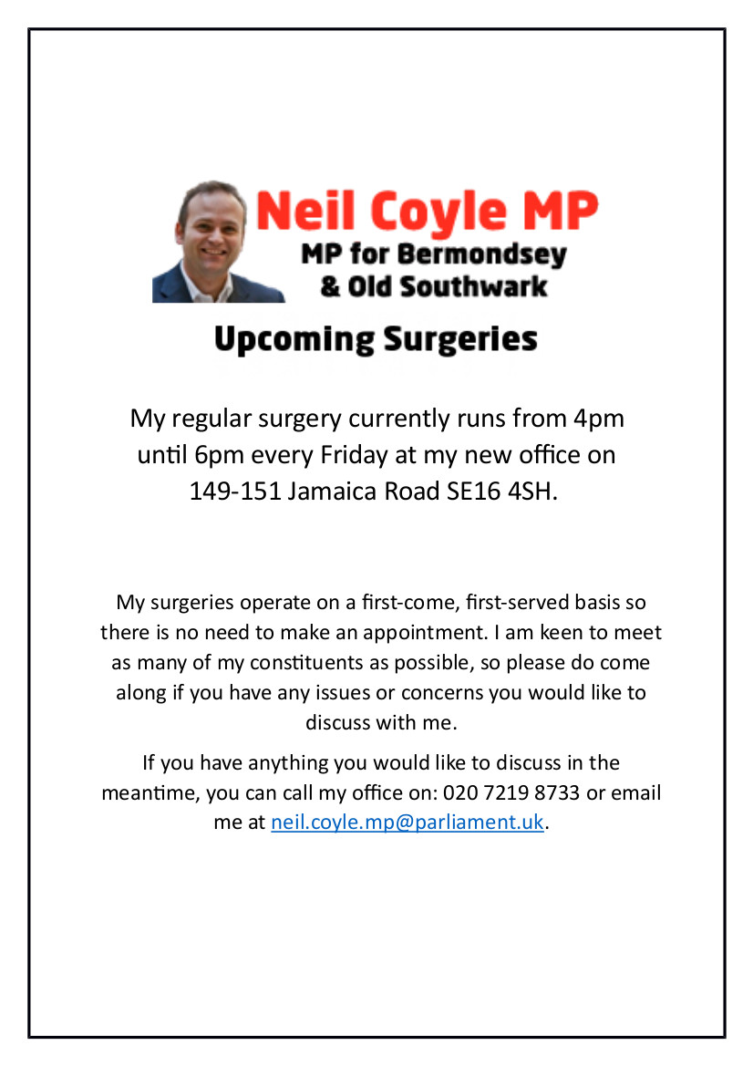 Neil Coyle MP, surgery details. Posted by tgntra 0 Share this: Click to share on X (Opens in new window) X Click to share on Facebook (Opens in new window) Facebook Like Loading... Related