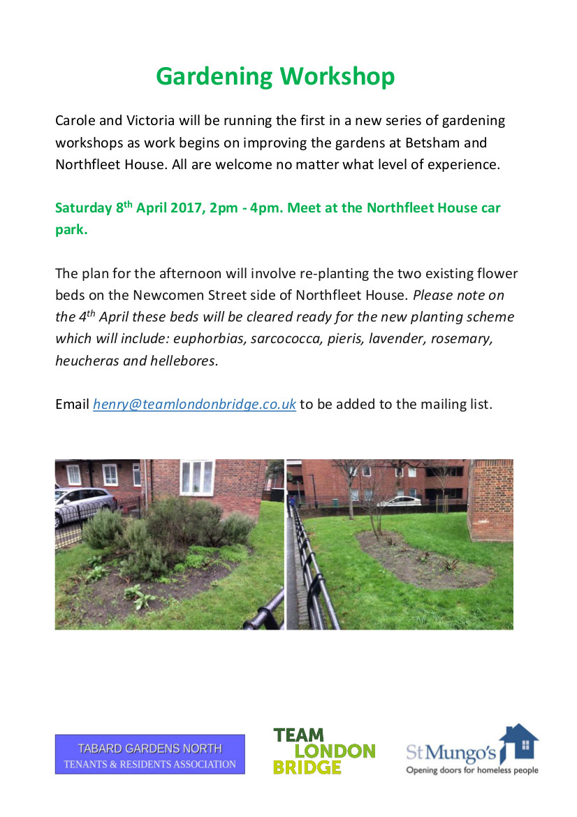 Gardening Workshop, 8th April in association with Team London Bridge Posted by tgntra 0 Share this: Click to share on X (Opens in new window) X Click to share on Facebook (Opens in new window) Facebook Like Loading... Related