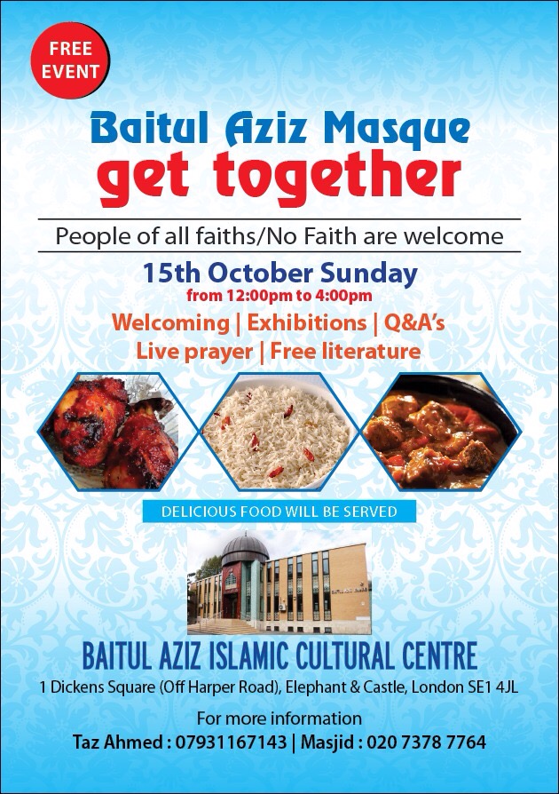 Baitul Aziz Mosque ‘open day’, 15th October Posted by tgntra 0 Share this: Click to share on X (Opens in new window) X Click to share on Facebook (Opens in new window) Facebook Like Loading... Related