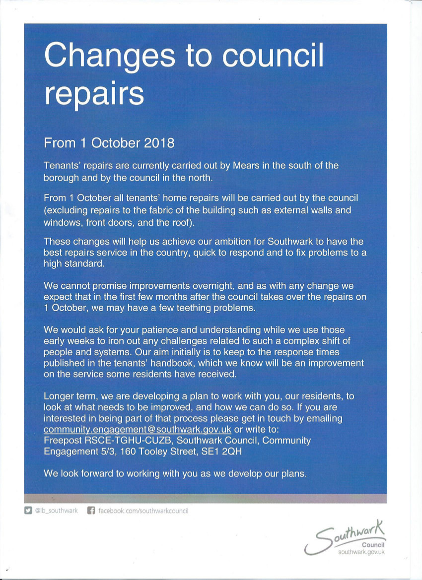 Changes to the Council Repairs, 1st October Posted by tgntra 0 Share this: Click to share on X (Opens in new window) X Click to share on Facebook (Opens in new window) Facebook Like Loading... Related