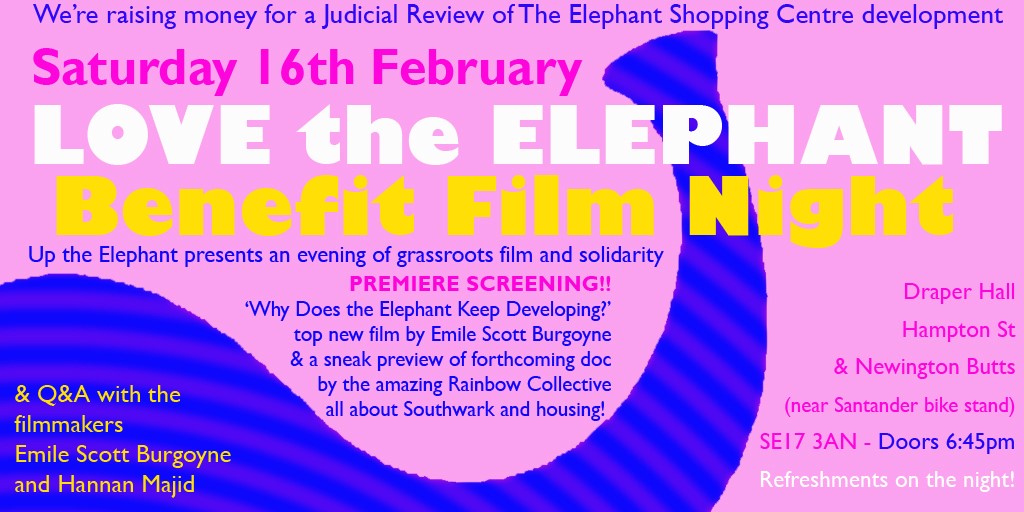 PREMIERE    Why Does the Elephant Keep Developing? (20 mins)Documentary filmmaker Emile Scott Burgoyne tracks the progress of the Elephant and Castle redevelopment scheme and the vibrant campaign to save our Elephant, asking some uncomfortable questions of the powers-that-be.