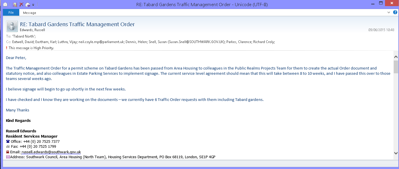 I would like to provide you with an update regarding the proposed Traffic Management Order to be implemented in Tabard Gardens. As you are aware we consulted on this with residents some time ago and the proposal was approved at Community Council around December 2014.